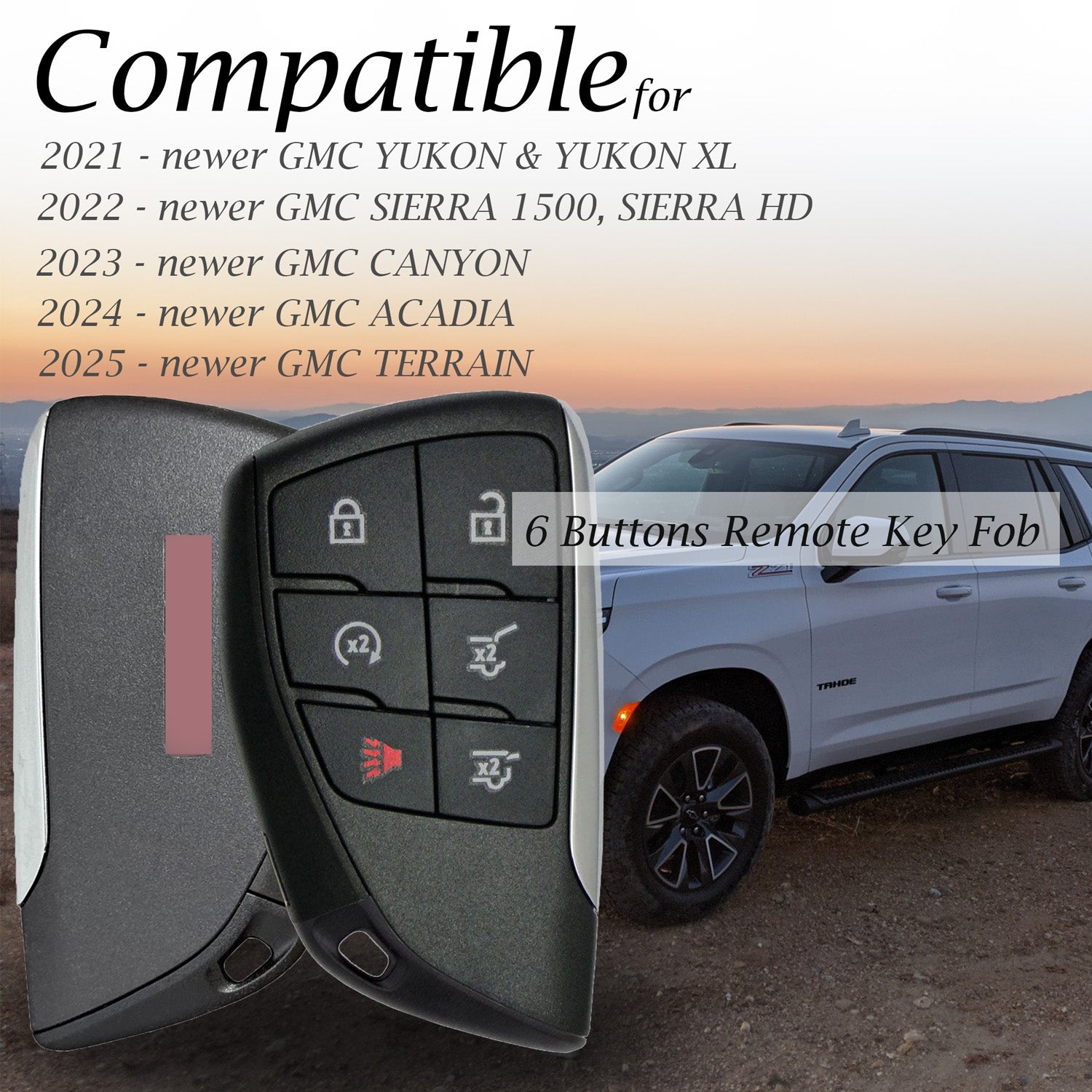 Compatible for GMC CANYON (2023 - 2026), SIERRA (2022 - 2026), TERRAIN (2025 - 2026), ACADIA (2024 - 2026), YUKON & YUKON XL (2021 - 2026) with 6 buttons remote key fob (Note: Only for Push Button Start). Please compare the picture with your key fob before purchase.
