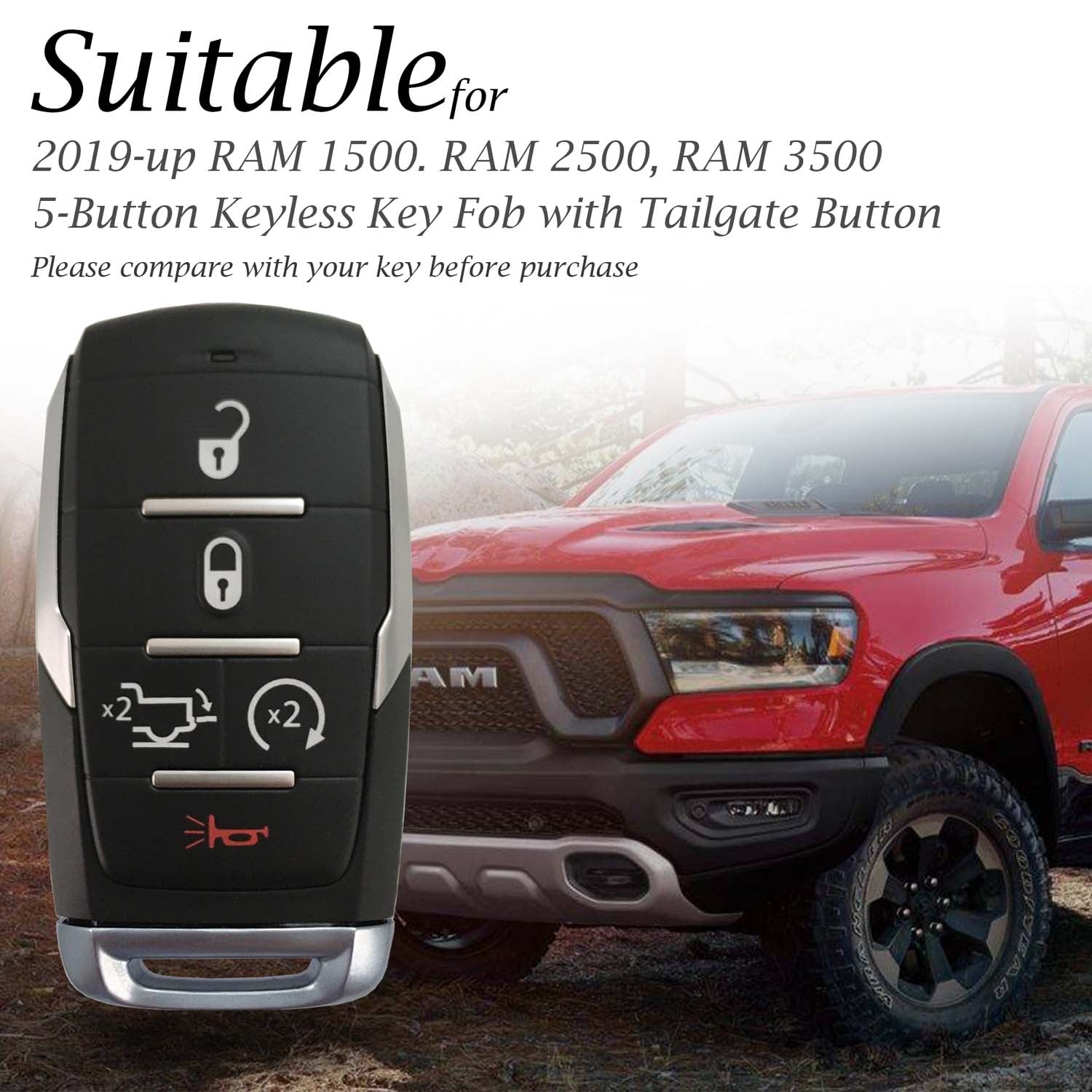 Compatible for RAM 1500, RAM 2500, RAM 3500 2019 - 2026 with 5-Button Smart Key Fob (Note: Only for Tailgate Button). Please compare picture with your key fob before purchase.