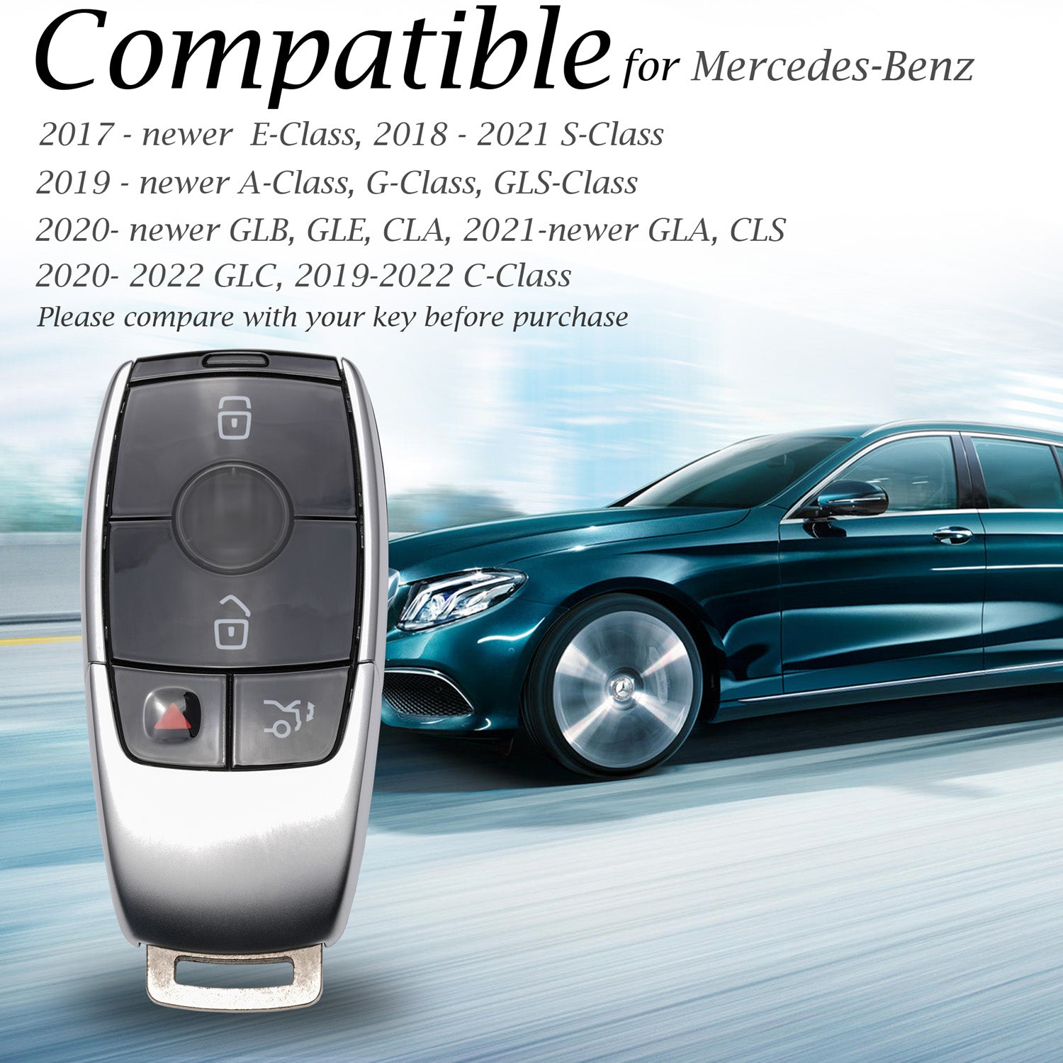 Compatible for 2017-up E-Class, 2018-2021 S-Class , 2019-up A-Class, G-Class, GLS-Class, 2020-up GLB, CLE, CLA, 2021-up GLA-Class, CLS-Class, 2020-2022 GLC, 2019-2022 C-Class with 4-Button Smart Key Fob (Note: Only for Push Button Start). Please compare the picture with your key fob before purchase.